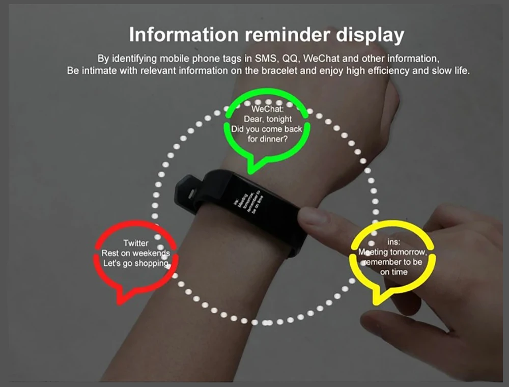By identifying mobile phone tags in SMS, QQ, WeChat and other information, Be intimate with relevant information on the bracelet and enjoy high efficiency and slow life.