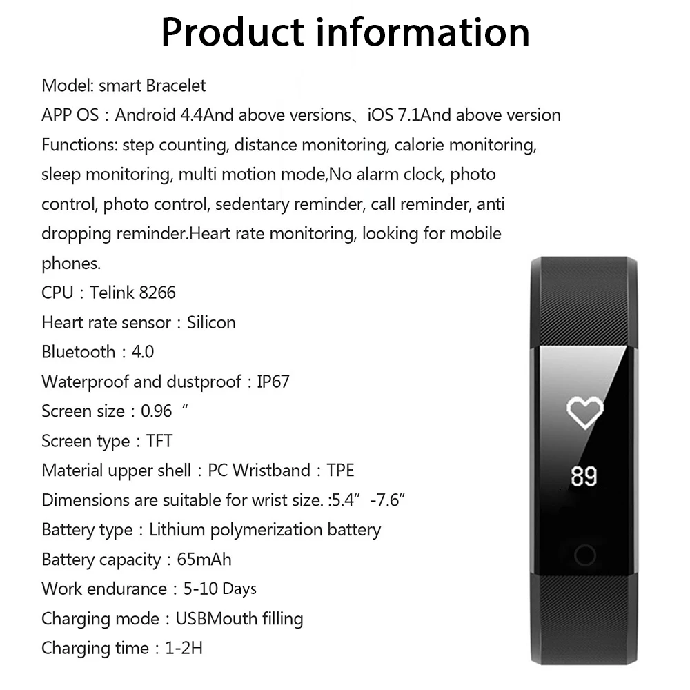 Function: Passometer,Fitness Tracker,Sleep Tracker,Message Reminder,Call Reminder,Remote Control,Push Message,Alarm Clock,Speed Measurement,Month,Moisture Measurement,Heart Rate Tracker,Calendar